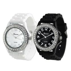 Here are some of the great features of Women's Geneva TWO Black & White Platinum Silicone Rubber Jelly with CZ Crystal Rhinestones Face Bling Bezel